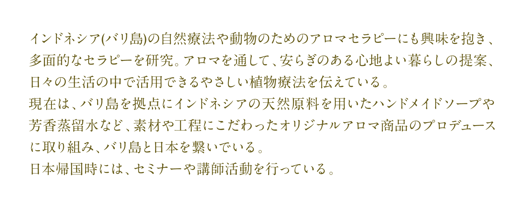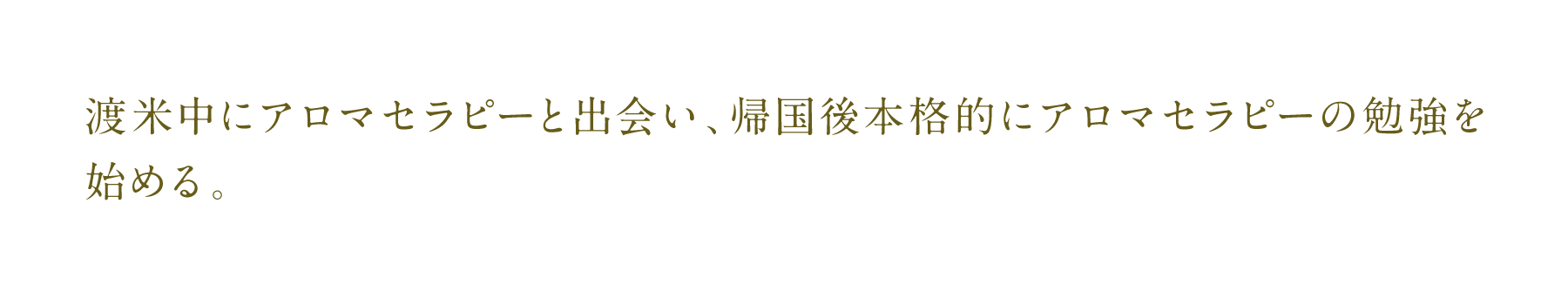 I discovered Aromatherapy during my stay in California USA between 1992 to 1996. I had an opportunity to experience an Aromatherapy massage from my American friend who was an Aroma therapist and Yoga Teacher. That became a life-changing event for me. Soon after my return to Japan, I started to delve deeper into the world of Aromatherapy.